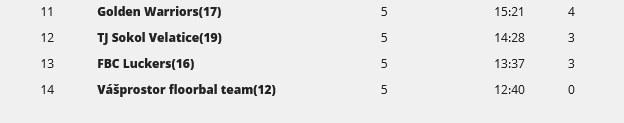 Náš první soupeř je  TJ Sokol Velatice a hrajeme s ním první zápas v 14:00 na Hattricku!  Druhý zápas je v 16:15 s  FBC Luckers a třetí s našim tréninkovým týmem Golden Warriors v 17:45. Všichni tři soupeři jsou hratelní, záleží na nás a trochu toho štěstí třebas také pomůže.